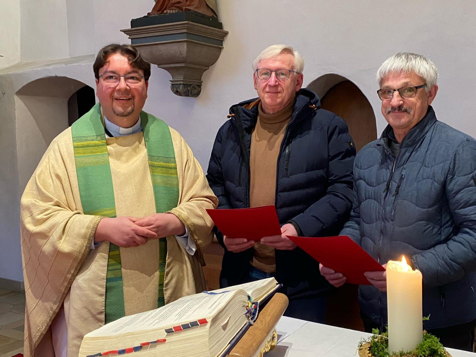 Werner Jadasch und Georg Raab wurden für ihr 12-jähriges ehrenamtliches Engagement in der Feldheimer Kirchenverwaltung als Kirchenpfleger und Kirchenverwaltungsmitglied mit Urkunden geehrt. Stadtpfarrer Biercher verlieh ihnen die Urkunden des Augsburger Generalvikars im Rahmen eines Gottesdienstes und dankte den Geehrten herzlich für ihren Einsatz für die Pfarrei St. Georg.