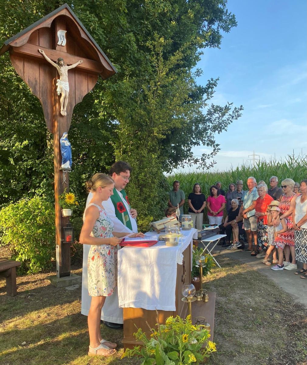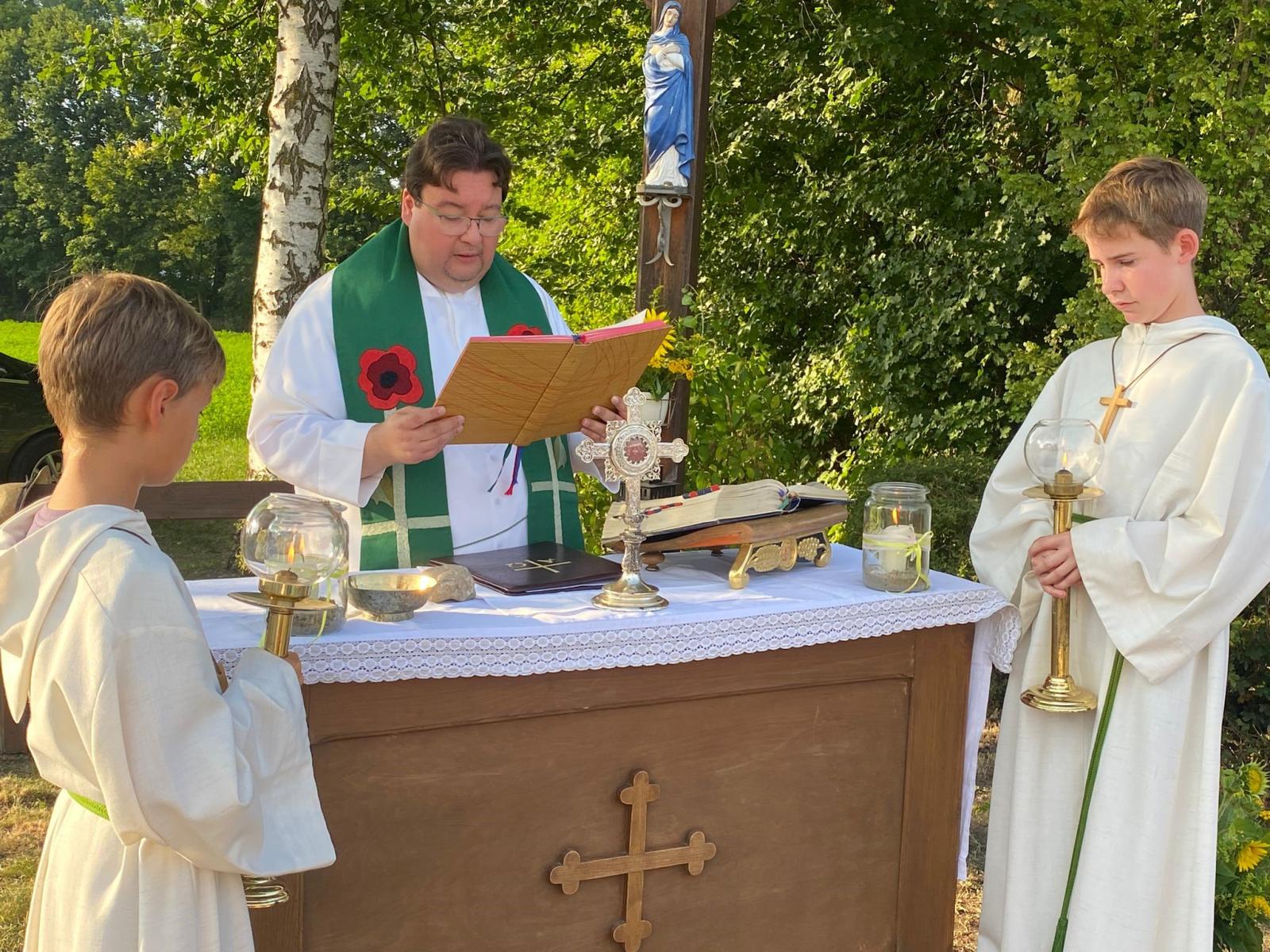 Beim jährlichen Gottesdienst am "Zellerkreuz" feierte Stadtpfarrer Biercher mit Gläubigen aus Feldheim und Umgebung die Heilige Messe unter freiem Himmel. In seiner Predigt betonte er, dass Jesus die Menschen gelehrt habe, sich nicht vom äußeren Schein blenden zu lassen, sondern auf das Herz zu schauen. Deshalb sollten wir als Christen darauf achten, ein weites und gütiges Herz zu haben, damit sich der Nächste unter unserem Blick wohlfühlen und aufatmen kann.