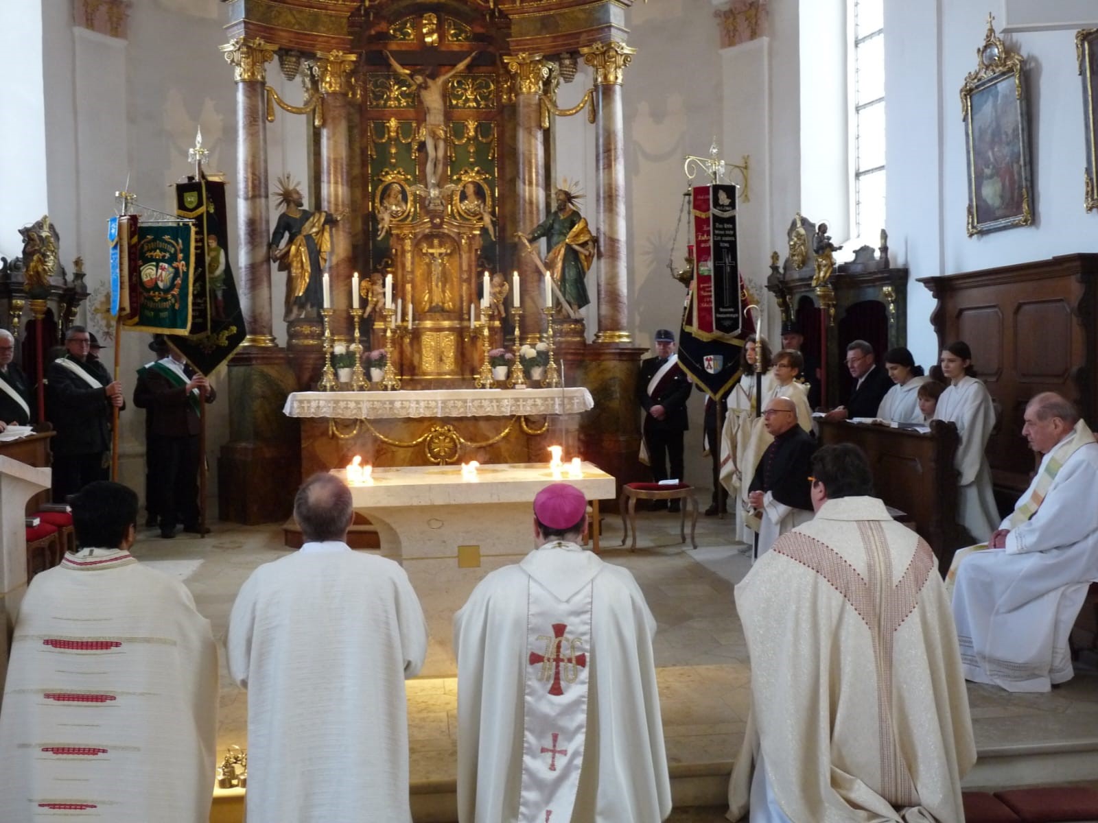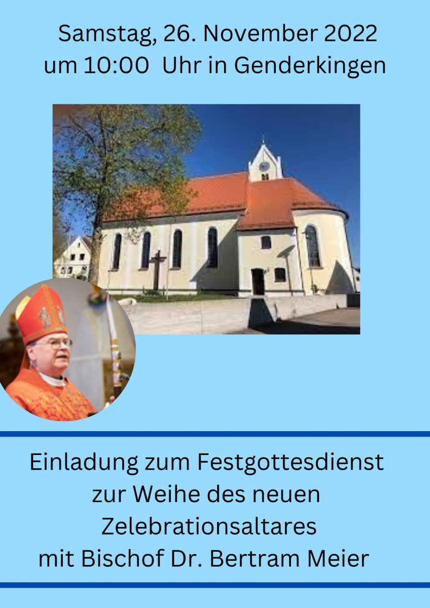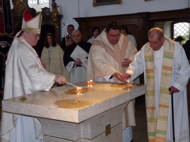 In einem feierlichen Pontifikalamt konsekrierte Bischof Dr. Bertram Meier den Neuen Zelebrationsaltar in der Genderkinger Pfarrkirche St. Peter und Paul. Nach der Waschung mit Weihwasser, der Beisetzung der Reliquien des sel. Carlo Acutis und der hl. Anna Schäffer und der Salbung des Altarsteins mit dem heiligen Chrisamöl wurde Weihrauch auf dem Altar verbrannt - als Zeichen für das Gebet der Gläubigen, das von dieser heiligen Stätte zu Gott emporsteigen soll. Nach der Anrufung aller Heiligen und dem Singen des Heilig-Geist-Hymnus sprach der Bischof das Weihegebet über den Altar.