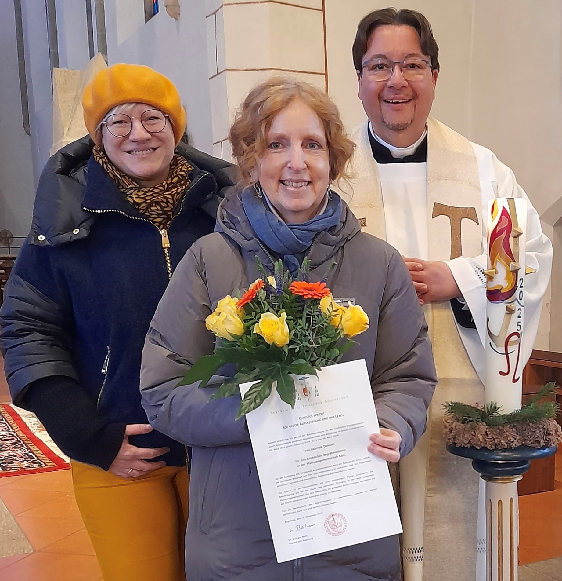 Nachdem alle Anforderungen erfüllt wurden, ist nun das Dekret von Bischof Dr. Bertram Meier eingetroffen. Gabriele Demuth wurde offiziell mit der Leitung von Begräbnissen beauftragt. Die würdevolle Leitung von Begräbnisfeiern ist eine bedeutende und unverzichtbare Aufgabe im pastoralen Dienst. Im Jahr 2024 hat unser Diözesanbischof deshalb eine neue Rahmenordnung für den kirchlichen Begräbnisdienst durch hauptamtliche Mitarbeiter erlassen.
