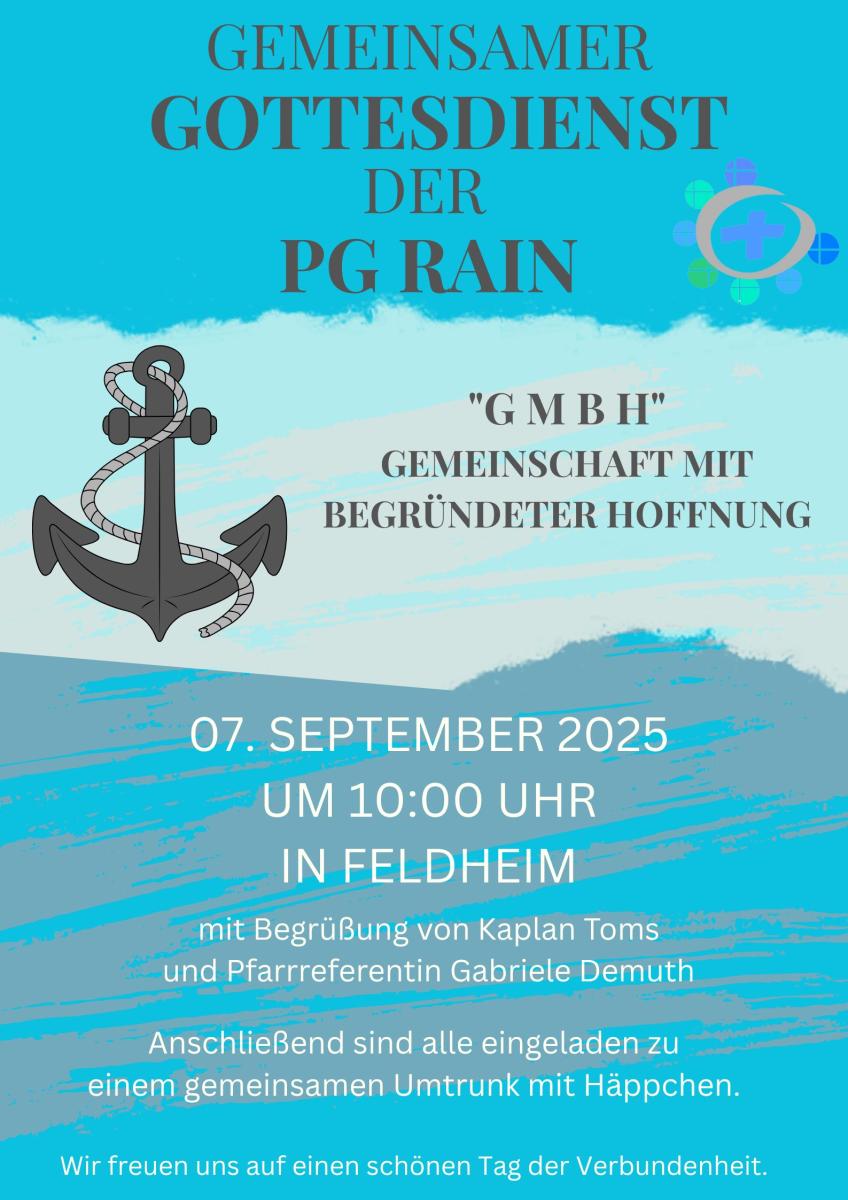 Die „GmbH“ – Abkürzung für „Gemeinschaft mit begründeter Hoffnung“ – zog sich als roter Faden durch den dritten Gemeinschaftsgottesdienst der Pfarreiengemeinschaft (PG) Rain. Der heurige Gastgeber „St. Georg“ Feldheim hatte den Platz zwischen Kirche und Kindergarten festlich bereitet. Stadtpfarrer Jörg Biercher feierte in Konzelebration mit Kaplan Toms Abin und Ruhestandsgeistlichen Paul Großmann den Gottesdienst.