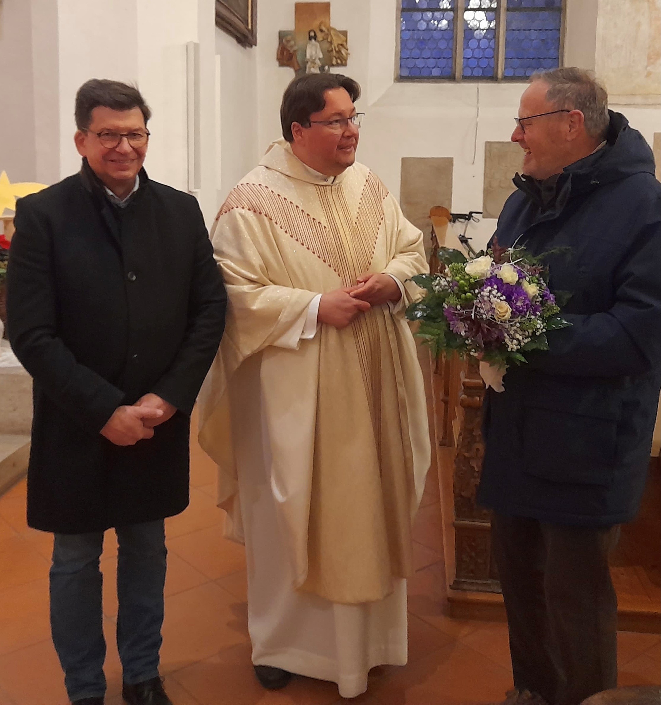 Bei der feierlichen Jahresschlussmesse am Silvestertag bedankten sich Pfarrer Biercher und Kirchenpfleger Martin ganz herzlich mit einem Blumenstrauß bei Helmut Herz, der im vergangenen Jahr nach seiner Tätigkeit als Aushilfsmesner ausgeschieden ist, für sein „beherztes“ Engagement in unserer Pfarrgemeinde.